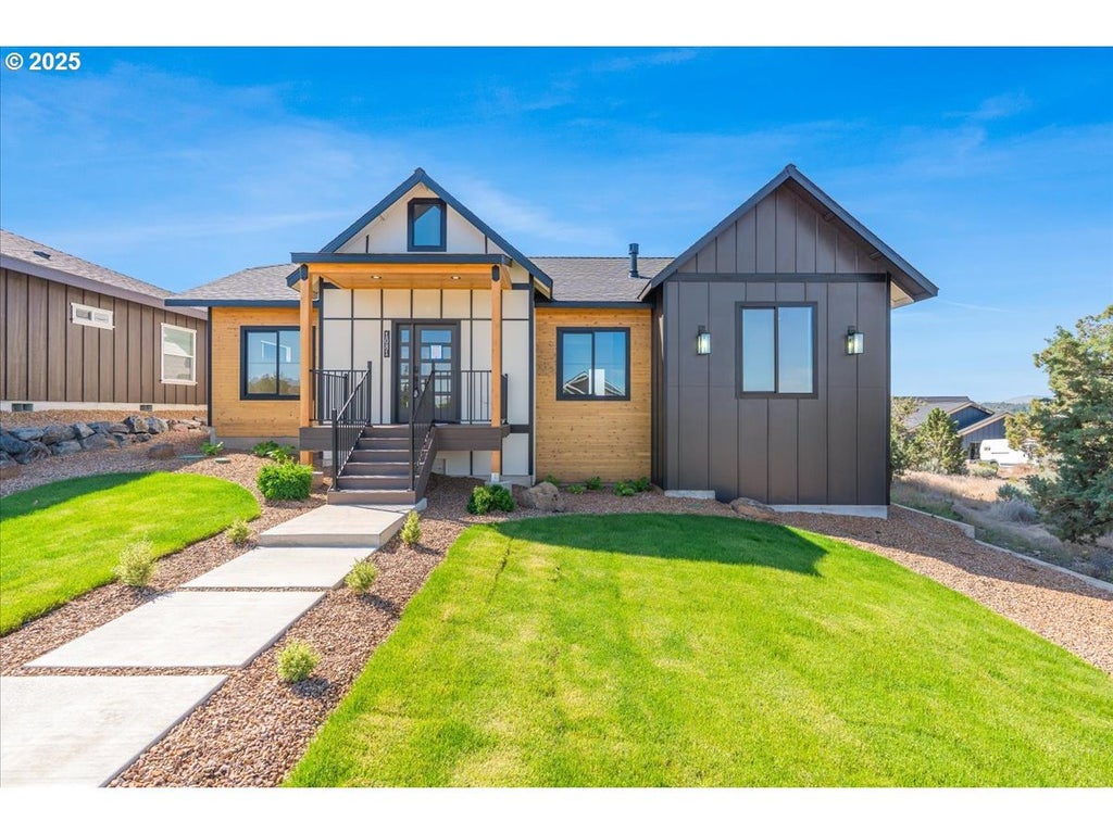 Stunning Modern Farmhouse-Style Home with Panoramic Views. This beautiful 1,539 sqft New construction home in Madras seamlessly blends Modern Farmhouse charm with thoughtful design and high-end finishes. The open-concept floorplan offers 3 bedrooms, 2 bathrooms, thoughtfully designed for comfort and style. Step inside and enjoy: A kitchen waterfall island with quartz countertops—the heart of the home. Stainless steel appliances, plus refrigerator, washer, and dryer included. A cozy gas fireplace with a striking black stone surround. Durable LVP flooring, complemented by plush carpet and tile. A spacious primary suite featuring with bathroom and walk-in closet. A two-car garage for ample storage and convenience. Enjoy panoramic views from the large windows, bringing the beauty of the surrounding landscape into your everyday living. Outside, enjoy a fenced yard with landscaping and a sprinkler system—perfect for outdoor living and entertaining. This beautiful home is move-in ready!