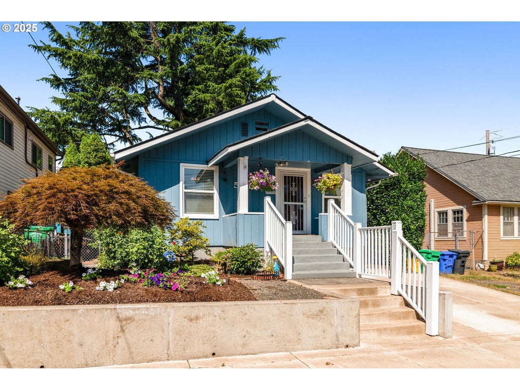 Adorable Woodstock cottage loaded with charm. Main floor features original hardwood floors and trim. Period-perfect kitchen has stainless steel appliances, eating bar and built-in desk. Two bedrooms on main level with updated continental bathroom. Lower level includes large flex room (including gas woodstove) which could serve as third bedroom with nearby second bathroom, plus unfinished space with laundry area, tons of storage and lots of potential. Peaceful private garden has lush, mature landscaping, large deck for entertaining, stone patio and garden shed. The blueberries are bountiful! New heat pump and air conditioning in 2022. Off-street parking. Very quiet street just four blocks to Woodstock Park. Easy walk to shops, restaurants, farmer’s market and The Heist food cart pod in Woodstock Village. [Home Energy Score = 4. HES Report at https://rpt.greenbuildingregistry.com/hes/OR10239891]