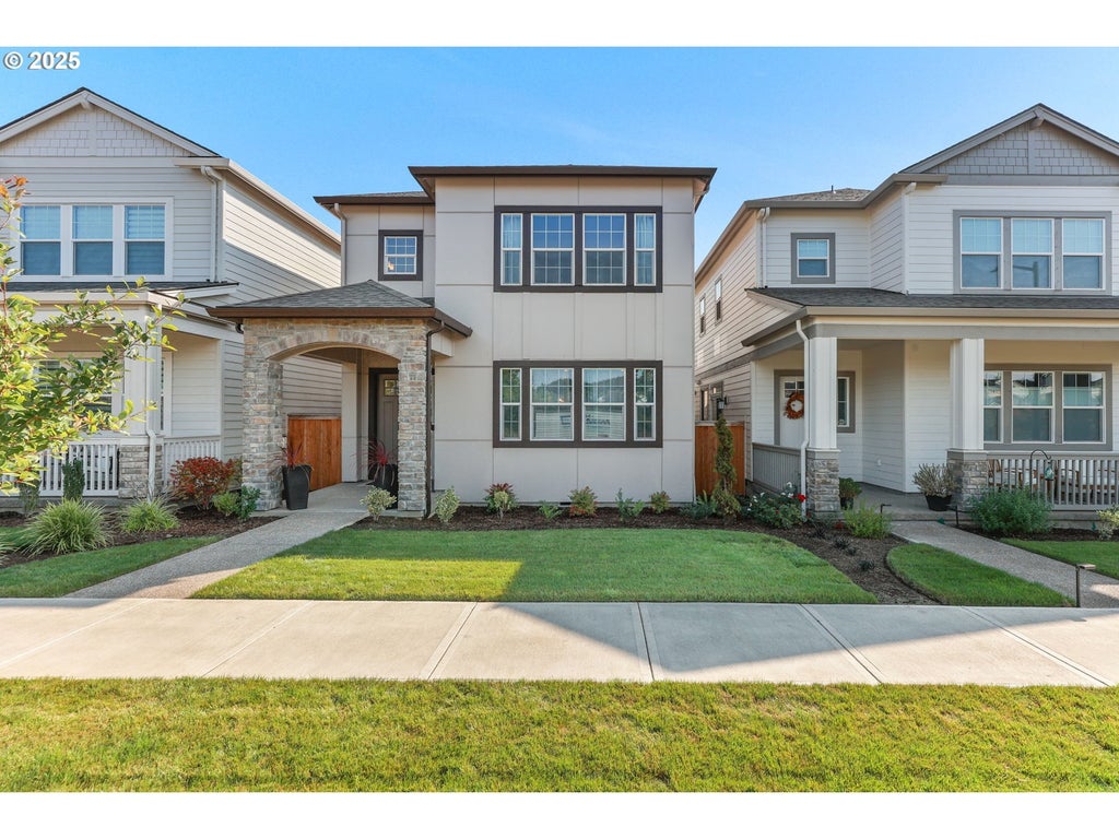 Better than New and on the market. Craftsman Style with Rear Loading garage, and includes Refrigerator, Washer, Dryer, Blinds, and AC. Downstairs is blessed with an open feel and 10' high ceilings, large windows for tons of natural light, and a Chef Style Kitchen. Gas Fireplace for those cold nights, and enough room for everyone to join in on the fun. Upstairs is 4 more bedrooms, including the Large Primary Suite, with Walk-In Closet, Soak Tub, and Walk-In Shower. This Gem sits across from a Small Park Area, and has great schools, and also close to Shopping. Seller is motivated.