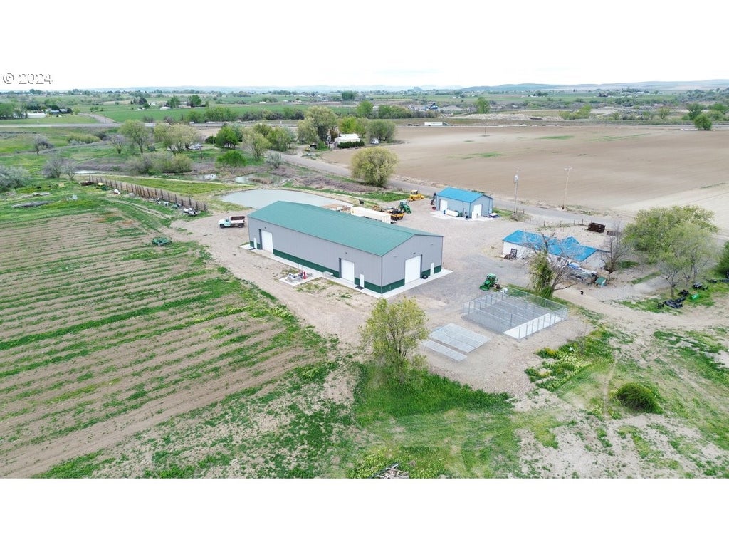 This 77.37-acre property offers pristine land ideal for agriculture and development potential, allowing for subdivision into 10 two-acre parcels. Seller financing available! Owner will carry at 5% interest. It includes 55 acres of water rights, several run-off ponds, and a 1/4-acre lined pond with a pump, filtration system, and beach area for swimming. The well-maintained, fully fenced land features large mature trees, buried irrigation, and a year-round creek. Two manufactured homes, each with 3 bedrooms, 2 bathrooms, their own septic system, address, and power meter, are situated on foundations. The property also has three wells and two large shops: a 120x50-foot insulated shop with water, septic, and 3-phase power hookup, and a 30x40-foot shop with 220 Amp service. The terrain is predominantly flat with gently sloping areas, offering stunning mountain views.