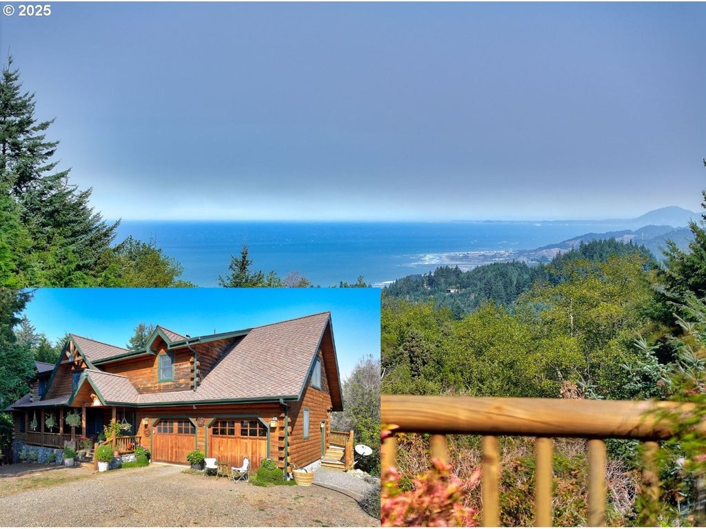 Perched above it all, this custom-built log house showcases views for miles of the Pacific Ocean, Rogue River Bay, and the majestic Humbug Mountain. Crafted from Pennsylvania white pine, the home comes fully furnished and exudes warmth and character. Soaring vaulted ceilings and a stunning rock fireplace frame the living room, where expansive windows capture the ever-changing ocean vistas. The cook’s kitchen is a dream with granite counters, custom cabinetry, and stainless steel appliances. The upper level offers two master suites, a cozy loft sitting area, and a convenient laundry room. On the main living level, you’ll find a third bedroom, a full bathroom, and a media room—perfect for guests or gatherings. Built with self-sufficiency in mind, the home includes a generator back up for peace of mind and uninterrupted comfort. Step outside and enjoy the lifestyle this property was designed for-an entertainer’s deck, greenhouse, raised garden beds, nature trails, a firepit deck, and a detached shop with attached workshop/extra garage. Plenty of space is available for RVs, boats, and all your toys. Nestled just out of the wind and fog, this mountain retreat offers a rare combination of privacy, natural beauty, and sweeping views that will take your breath away.