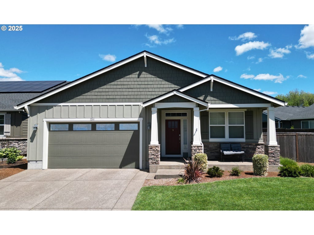 This beautifully maintained single-level home offers modern comfort and thoughtful design in the Laurel Woods community of Cornelius. Built in 2020, it features 3 bedrooms, 2 bathrooms, and a bright, open-concept layout with stylish contemporary finishes throughout. Situated on one of the largest lots in the neighborhood, the home showcases a lushly landscaped garden and a spacious, manicured backyard—ideal for entertaining, relaxing, or recreation. The backyard includes a variety of perennial plants such as blueberries, lavender, strawberries, and artichoke. A north-facing covered patio stays shaded throughout the day, providing a comfortable space for year-round enjoyment.The interior layout is designed for both function and privacy, with the bedrooms separated from the main living areas. A conveniently located hall bathroom serves guests and household members alike, while a dedicated laundry room—set apart from both bedrooms and living areas—adds extra convenience and quiet.The spacious two-car garage fits a large vehicle such as an SUV while still allowing ample room for organized storage. Gardeners and outdoor enthusiasts will appreciate the expansive eastern side yard, ideal for planting while keeping the backyard open for lawn games, inflatable pools, or even occasional tent camping. The western side yard allows for easy access and storage of trash and recycling bins.Additional features include a front door upgraded with a peephole and door knocker, solar-ready infrastructure for potential energy efficiency, and front yard maintenance provided by the HOA.Enjoy added privacy with the home located across from a protected wildlife area and set several blocks back from the main highway. Laurel Woods offers a range of community amenities including walking trails, fitness stations, benches, a neighborhood park, and scenic overlooks—all just steps away.Don’t miss the opportunity to own a thoughtfully designed home in one of Cornelius’s most peaceful community.