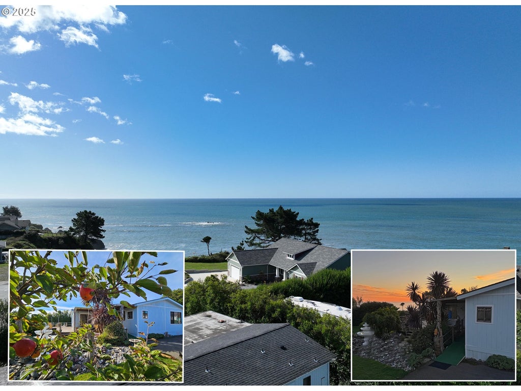 OCEAN VIEW AND INCREDIBLE SUNSETS! Enjoy the lovely spring blooms, a delightful mix of flowers adding color throughout, an abundance of shrubs and succulents, a unique monkey tree and fruit from your own fruit trees. This 0.53-acre property is connected to public water and sewer, has 2 homes, 2 driveways, a carport and a detached garage/workshop with plenty of storage in the loft area The main home is a 1980 manufactured home with 4 bedrooms total, two are primary bedrooms, 3 bathrooms and with the addition has 2,144 sf. The 1965 single-wide mobile home has 2 bedrooms, 1 bathroom and will either need complete renovation or be replaced. A tall hedge beside the house and garage belongs to neighbors and cannot be cut, providing the benefit of added privacy. This property is full of potential! OUT OF RESPECT FOR THE NEIGHBORS PLEASE NO DRIVE-BYS. SHOWINGS BY APPT ONLY.