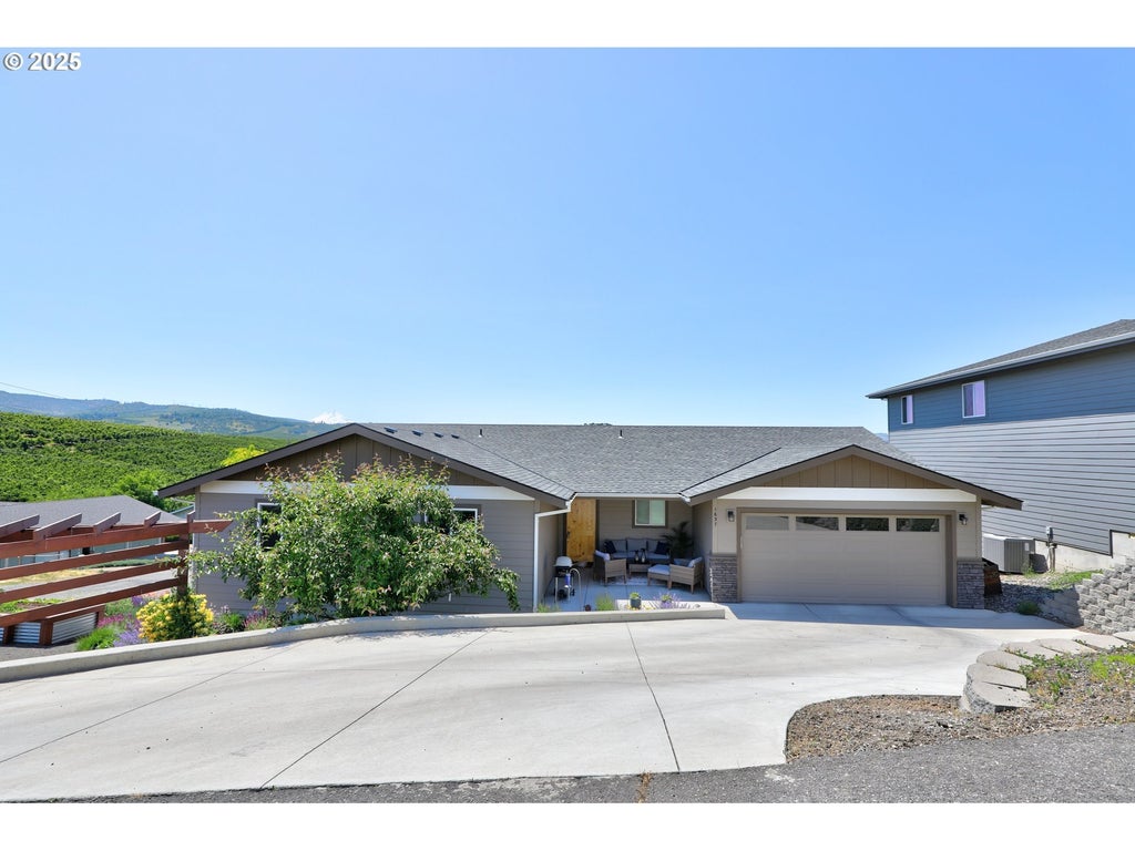 Move right in to this fabulous four bedroom contemporary home on the hill with views of Mount Hood and a valley of cherry orchards. This lovely home constructed in 2019 is filled with upgrades and improvements including a deck, lovely garden space with arbor and raised bed gardens as well as low maintenance landscaping and plantings. Inside the quality laminate flooring and wide entry hall opens to a gorgeous kitchen with honed granite counters, stainless appliances, walk in pantry and a large island. The great room concept allows for easy entertaining from the kitchen with dining and spacious living space combined. There is a double door to the outdoor dining deck which is a great vantage point for observing the views. The spacious primary suite is opposite the guest bedrooms with a walk in closet, double tile shower with glass enclosure and a double sink vanity with granite counter, it is the ultimate retreat at the end of a long busy day.The three guest bedrooms and full guest bathroom has views of the gorgeous gardens. You will find a laundry room off the front door entry that walks through to the attached main level garage (measures 20 x 22 per county records).The lower level garage is approximately 504 sq ft (measures 18 x 28 per county records) and has a nice big access door to the crawl space.