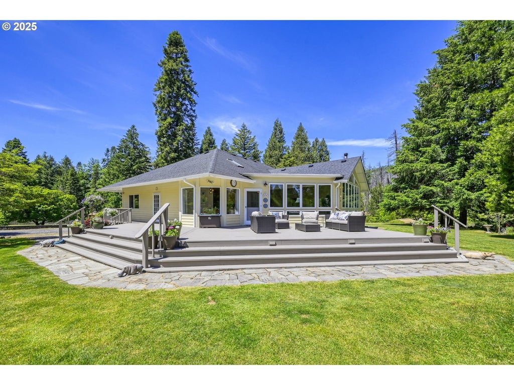 Experience The Island Life, Oregon Style! This rare 1.32-acre riverfront retreat boasts 836 feet of rushing whitewater frontage along the McKenzie River—destined to become someone’s dream home.The single-level showplace has been fully renovated from top to bottom, designed to capture the beauty of its surroundings. Expansive windows flood the interior with natural light while framing breathtaking views of the river, majestic mountains, and the historic Belknap Covered Bridge. Step outside to a wraparound deck system that makes outdoor living as captivating as the indoors. A detached oversized two-car garage with covered RV parking also includes a clever 500+ sq. ft. man-cave perfect for hobbies, guests, or retreat space. The landscaped grounds are just as impressive, featuring a picturesque pond, a wide-open lawn, and a gazebo ideal for gatherings both large and small.Recreation abounds with world-class rafting, hiking, and mountain biking just minutes away, Tokatee Golf Course nearby, and Hoodoo Ski Resort only 50 miles up the pass.