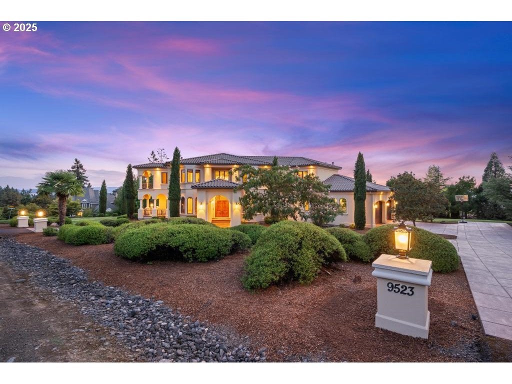 Set on a private, 1.51 acre lot beside Cooper Mountain Nature Park in Corrine Heights, this Mediterranean-inspired estate offers timeless elegance with luxury living. Guests are welcomed by a porte cochere opening to a dramatic foyer featuring vaulted ceilings, a grand chandelier, and a sweeping split staircase. Designed for both entertaining and everyday living, the open floor plan connects the gourmet chef’s kitchen—cherry cabinetry, granite counters, high-end appliances and dual pantries—with the family room and veranda. Outdoor living includes a wraparound covered veranda, gas fireplace, and outdoor kitchen with panoramic sunset views. Inside, 12 foot ceilings and grand fireplaces serve as stunning focal points, complemented by heated travertine tile floors, cherry hardwoods, and custom millwork. With flexible rooms for media, fitness, and play, the home adapts to any lifestyle. The executive office features built-in bookshelves and french doors that open directly to the terrace, while a main-level bedroom with ensuite bath allows for multi-generational living. The upstairs primary retreat impresses with a sitting area, fireplace, private terrace, and spa-inspired bath. In a community of prideful ownership, friendly neighbors, and large lots, this home offers privacy and connection in equal measure. Conveniently close to Cooper Mountain Vineyards, Progress Ridge shopping center, restaurants and the Hillsboro tech corridor.