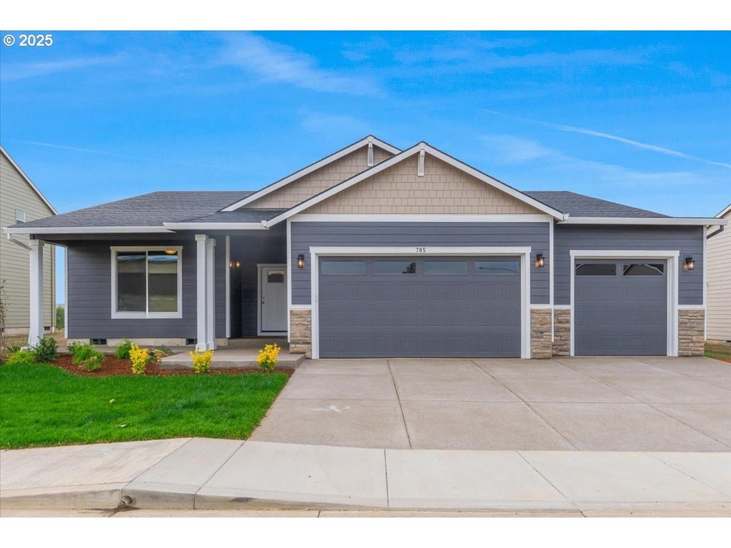 New Chad E Davis Construction home. Large one level with 4 bedrooms and 3 -car garage. Great room with fireplace and 9ft ceilings with vaults. Well appointed kitchen with quartz countertops, ss appliances and full tiled backsplash. Vaulted primary suite with walk in closet and full bath with soaking tub. Front landscaping with irrigation included. Taxes TBD.