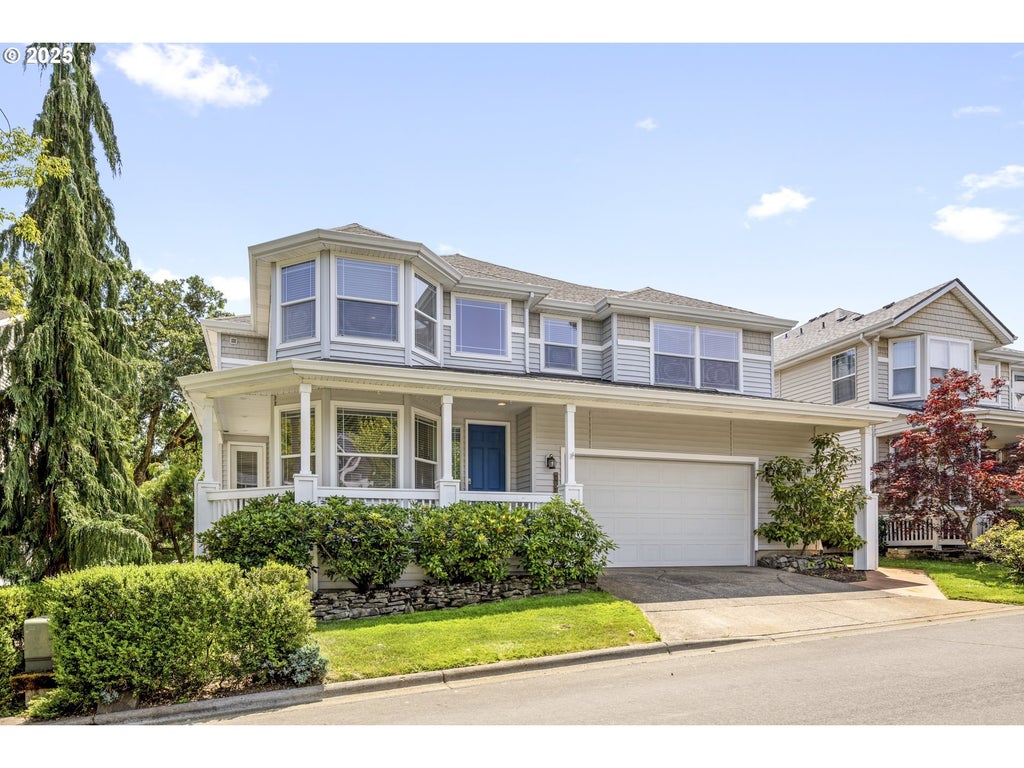 Come home to gorgeous curb appeal with stunning outdoor living! With a wrap-around porch and charming back patio overlooking the beautiful, terraced landscaping with fig tree and ornamental bananas, this wonderful Wilsonville residence evokes a tropical vibe ready for your summer barbeques. Inside, the vaulted entry opens to a bright interior with an open concept living space. Thoughtful floorplan offers a welcoming living room for hosting centered around a cozy gas fireplace, while a spacious great room, complete with wet bar, and a main-level fifth bedroom readily offer flexibility for media room, home office or flex space, respectively. The tastefully updated kitchen boasts slab quartz counters, accent tile backsplash, and premium stainless steel appliances, including a six-burner ZLINE gas range. A sunny breakfast nook, opening directly to the patio, is ideal for seamless indoor-outdoor entertaining. Upstairs, the spacious primary suite features French door entry, a walk-in closet, and a luxurious en suite with dual-sink vanity, soaking tub, walk-in shower, and private water closet. Storage is incorporated throughout, including the kitchen pantry, laundry room cabinetry, and a large walk-in linen closet on the upper level. Low-maintenance features include vinyl flooring throughout the main living space and limited lawn area for summer yard care. Private area off patio is also plumbed for a hot tub. Conveniently located with easy access to I-5 and the Portland Metro area, and move-in ready!