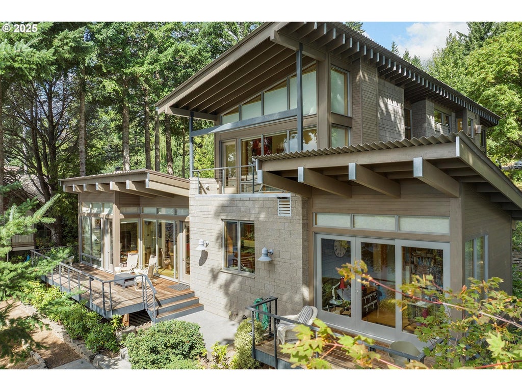 One owner, architecturally designed home, nestled under mature trees; it will catch you heart! Expansive views of the the Columbia River, Mt. Hood & the HR Valley will captivate you & offer year-round entertainment! The intriguing great room features engineered beams, bamboo floors & wall to wall windows on the south view side. A gourmet kitchen will appeal to the chef of the family with a Viking Range top & Double Ovens & a Subzero refrigerator! The vertical grain fir cabinetry & central island give this charming kitchen a really sophisticated appeal! The adjacent extra-large dining area opens onto the large entertaining ipe deck & you will enjoy a Huge Mt. Hood view as you dine or just sit & take in the world. The west end living area has marvelous light, a cozy propane fireplace insert & built in entertainment area for winter time relaxation. A bonus room, with bamboo floors & a deck is also found on this level: workout area, guest area or crafts room… your call! The light filled atrium features floating fir stair treads, gorgeous suspended light fixtures & fills the home with sunshine even on winter days! A laundry area is also tucked away on this level. Up a ½ flight of floating stairs to the guest wing; 2 pretty bedrooms flank a tiled bathroom with a vanity matching the gorgeous sea blue concrete floors. Radiant heat throughout this home so toasty feet year-round & AC too. The next ½ flight leads to the primary sleeping room with a private deck & stunning view. Just across the hall & up a ½ flight is a well-appointed primary closet, a beautiful primary bath & a full-fledged office. The bathroom has a wonderful soaking tub, a walk-in tiled shower & dual vanities. The north facing office features a gorgeous garden view & fabulous built ins. This tiered parcel features fire resistant vegetation, mature trees & stunning views! The double car garage will provide ample storage. This home has timeless beauty & was built to Last! (feature sheet attached)
