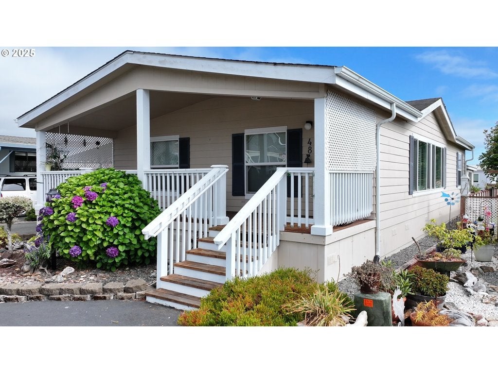 The new roof, carpets, and exterior paint are now complete! The inside of this beautiful home has been professionally cleaned. Bright & Spacious in Sunset View MH Park. This well-maintained 2-bedroom, 2-bath manufactured home offers 1,296 square feet of comfortable, functional living in one of the area's most desirable communities. Located in Sunset Strip Park, you're just a 7-minute drive to several stunning local beaches and close to shopping, dining, and entertainment. There are fabulous mountain views! Inside, you'll find an open-concept layout with vaulted ceilings, a beautifully updated granite kitchen, a spacious pantry, and a seamless flow into the dining and living areas. The living room is filled with natural light from several large windows, creating a warm and inviting feel. The split-bedroom design is ideal for privacy. The primary suite includes dual sinks, a walk-in shower, and a relaxing soaking tub. The guest bedroom and second full bath are located on the opposite end, perfect for privacy, visitors, or a home office. Enjoy outdoor living with a lovely covered front deck, a deep carport, and a fully fenced backyard that’s perfect for gardening, hobbies, or relaxing in the fresh coastal air. Three storage sheds offer ample room for tools, projects, hobbies, or seasonal items. Space rent is $620 per month and includes water and sewer. There is also a one-time $500 park deposit. Please ask to see the 3D tour! This home is move-in ready. Set an appointment to tour it today!