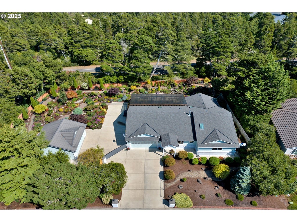 This beautifully updated residence features premium materials throughout its 2,354 sq. ft. layout. A 50-year architectural grade roof [2023]; new paint [2023-2024] inside and out; quartz countertops throughout; gas fireplace; all four [4] bathrooms have been redone with countertops, sinks, ADA toilets, ADA walk in showers and fixtures. The gourmet Kitchen is equipped with a gas cooktop and has an updated 10.5-foot quartz island complemented by extensive cabinetry for pantry space. Three new skylights and two solar tubes add additional lighting. The home has two master bedroom en suites with walk in closets; and an office/den or baby's bedroom. The laundry room is centrally located for convenience. A formal dining room seats 6-8 guests, with additional seating in the dining nook. Comfort is enhanced by heated floors in the entry and primary en suite bathroom. The expansive 16x40 covered patio provides excellent outdoor entertaining options, with a remote-controlled wind screen and three propane hook-ups to accommodate BBQs, fire rings, deck heaters. The property’s gardens were recognized as #1 on the 2025 Florence Garden Club Tour and are maintained effortlessly with an updated 12-zone irrigation system, and a beautiful water feature. The .52-acre lot offers both privacy and space to enjoy the landscaped grounds with extensive pathways. A detached 576 sq. ft. garage provides potential for third master en suite guest quarters, classic car storage or artist’s studio, with a bathroom and kitchenette. A 192 sq. ft. insulated tool and garden shed ensures protection for equipment against the elements. Additional features include an 18’x60’ concrete RV pad with a remote-control gate, suitable for parking up to four vehicles or an RV. ADA ramps in the gargage and deck for convenience. Located within the Shelter Cove gated community, this immaculate home offers an extensive list of amenities; please inquire for further details.