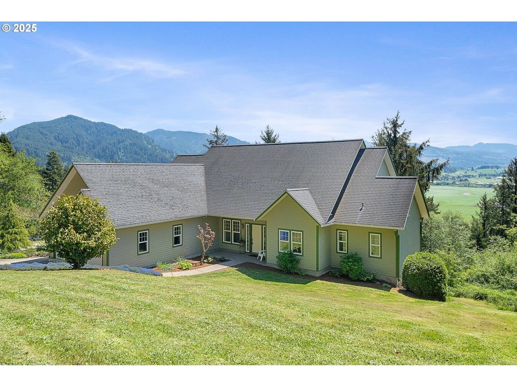 Breathtaking valley views from every level of this exceptional hillside home. 2 acres of landscaped grounds, enchanting gardens, a tranquil pond, & a wooded play area w/fire pit. Inside, you'll find 3 bedrooms, 3.5 baths, w/an office/library that easily converts to a 4th bedroom. Home boasts elegant Brazilian Cherry floors, luxurious granite & tile counters, & an open kitchen equipped for the discerning chef, complete with a spacious walk-in pantry. Master bath offers heated floors, while 9-foot ceilings and vaulted living spaces create an airy ambiance. Lower level features a wet bar/kitchenette, ideal for multi-generational living or teen hangout. Covered Trex decks provide spaces to relax & enjoy stunning views of the Tillamook Valley. Finished 24'x36' shop w/100& 220 amp service, cabinet shop lighting, heat, and water, as well as an attached greenhouse. Home constructed with Insulated Concrete Form (ICF) technology, that ensures energy efficiency and great acoustics!