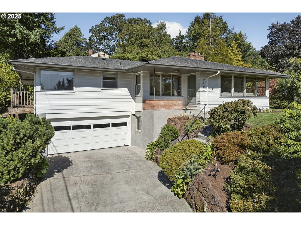 There's so much to love about this mid-century gem in Portland's sought-after Hillsdale neighborhood! Set up off the street, on a corner lot w/ beautiful, mature landscaping on all sides, this home enjoys great privacy and natural light. The living room is unlike any other. It's incredibly spacious, w/ fun, mid-century built-ins and design details, beautiful hardwood floors and lots of great, big, picture windows. The floor plan and positioning of this home is pretty perfect, too. The main floor puts living, dining and kitchen at the front of the home with 3 bedrooms and a full bathroom in the back and easy access to the backyard and patio from the kitchen and one of the bedrooms. Every window enjoys attractive views of the mature, variegated landscaping that surrounds the house. The light, bright lower-level has nice, tall ceilings and includes a big family room, 4th bedroom, 2nd full bathroom and great storage. Well cared for over the years, with valuable system improvements and thoughtful updates aligned with mid-century character and design. Recent updates include: lower-level bathroom remodel (incl new plumbing, shower pan, shower tile, and vanity - '25), new main water line ('25), new electric water heater ('24), new electric panel ('24), EV charging outlet ('24), generator outlet ('24), and new sewer line ('22). The backyard features a spacious covered patio off of the kitchen for year-round use and enjoyment, a covered deck off of one of the bedrooms, blueberry bushes, a Japanese nashi pear tree, blooming camellia bushes and so much more! With its super central location, this home enjoys several, quick commute options into downtown, NW, Lake Oswego and Beaverton. OHSU is just up the hill and a network of quiet, forested, nature trails minutes away. [Home Energy Score = 3. HES Report at https://rpt.greenbuildingregistry.com/hes/OR10134883]