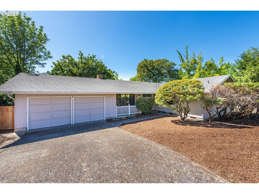 Charming, brightly lit one-story home on a spacious lot in a desirable West Eugene neighborhood. Features include air conditioning, double-door entry into large living room with fireplace, and separate dining area. The home is newly painted throughout and kitchen has a commanding sunset view and cozy breakfast nook. Enjoy all-new luxury vinyl plank flooring throughout the interior of the home, and double insulated sliding windows and exit to a covered back patio. The roomy primary bedroom includes an ensuite bath and two large closets, with two more spacious bedrooms and a full bath along the hallway. Stay comfortable year-round with efficient, well maintained central air conditioning and heat pump, or open the sliding glass door to a spacious south facing garden plot, situated behind a new fence. The back deck offers a covered patio for entertaining, newer decking, fenced yard, and a fantastic walking location that favors pets, families and friendly neighbors on tree lined streets.