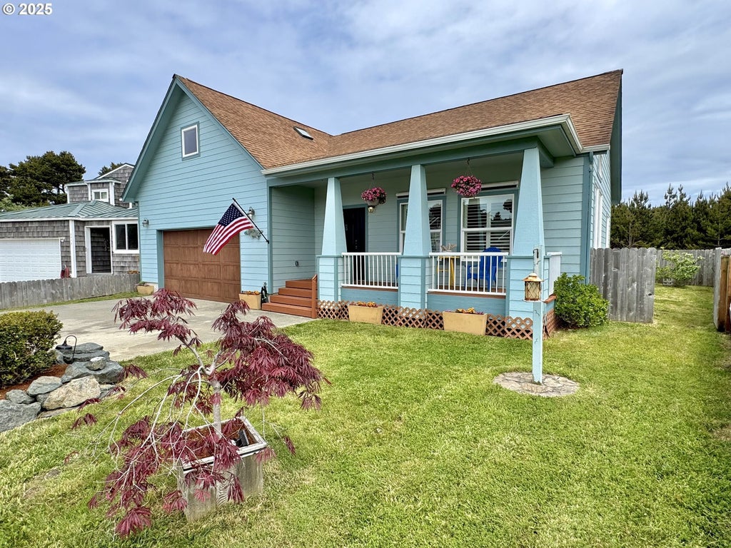$60,000 price drop — MOTOVATED SELLER! Tucked at the end of a quiet cul-de-sac in Surf Pines, this 2,412 sq ft open-concept Craftsman offers the perfect mix of privacy, space, and coastal charm — within minutes to the beach where you can hear the ocean from your yard. The main level features ~1,800 sq ft with 3 bedrooms and 2 bathrooms, including a spacious primary suite with a walk-in closet and an ensuite bath, plus soaring ceilings and tall windows that flood the living space with natural light. Upstairs adds another 600 sq ft with two versatile bonus rooms — perfect for a home office, guest space, workout room, or playroom. Enjoy morning coffee on the covered porch, entertain in the fenced backyard, and soak up the laid-back Oregon Coast lifestyle while being just minutes from Bandon’s beaches, world-famous Bandon Dunes Golf Resort, Whiskey Run mountain biking trails, and top dining. Seller is ready to move — don’t miss this one!